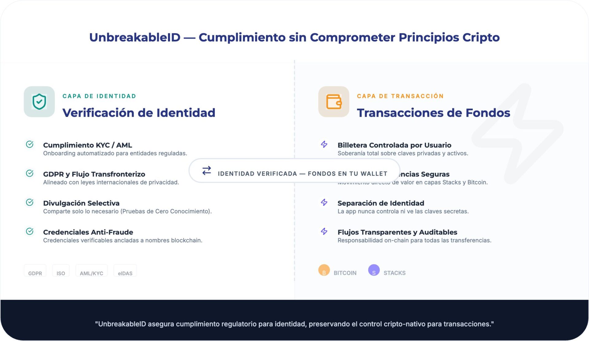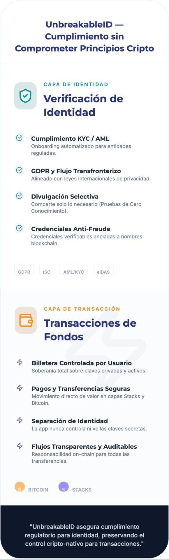 Capa de valor: transferencia de fondos ejecutada a través de Bitcoin o Stacks Wallet. UnbreakableID nunca toca los fondos.