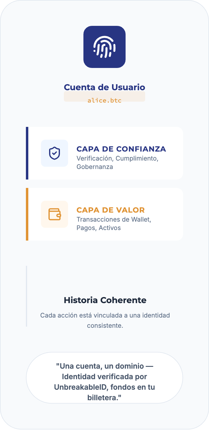 Al separar la confianza del valor y unificar ambos bajo la misma cuenta/nombre de dominio, UnbreakableID ofrece una identidad resistente al fraude y preparada para el cumplimiento normativo, con un uso coherente y rastreable de las aplicaciones. Las instituciones obtienen garantías normativas, los desarrolladores simplifican la integración y los usuarios mantienen el control de sus activos, todo ello bajo una identidad coherente.